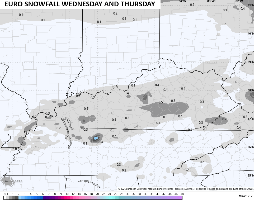 The system moving in for Wednesday and Thursday is light, but it’s likely to spit out a period of light snow and some rain, depending on where you are. As we get closer, there’s a little better signature for light accumulations, especially western and central Kentucky.
