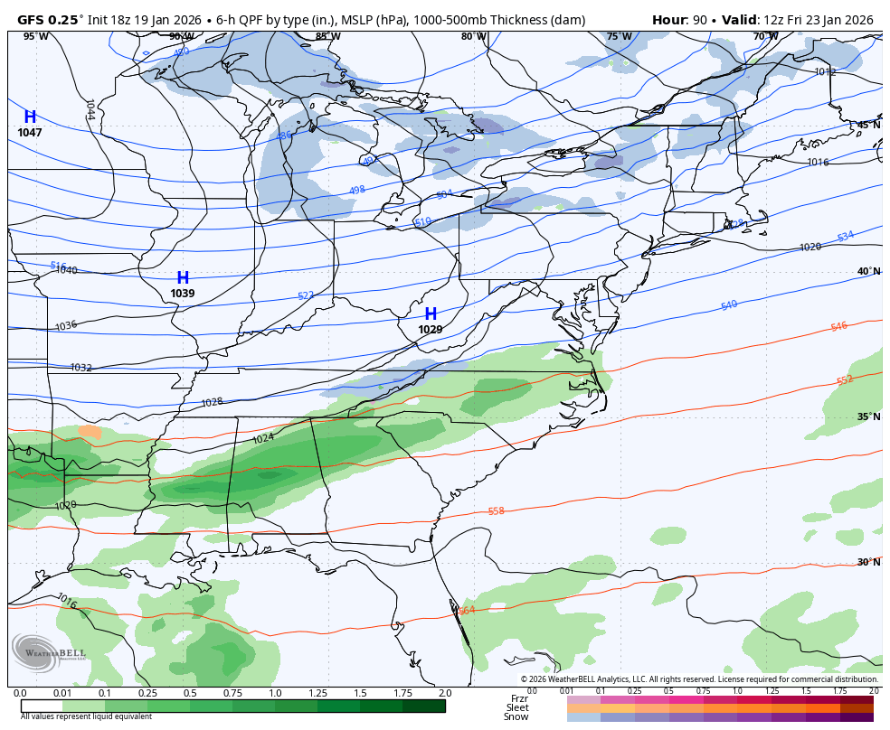 The late afternoon EURO looks a lot like the earlier run of the model and is farther south with the lead low, resulting in all snow around here. This run is also much slower with the movement, but this run only goes out through 1pm Sunday…