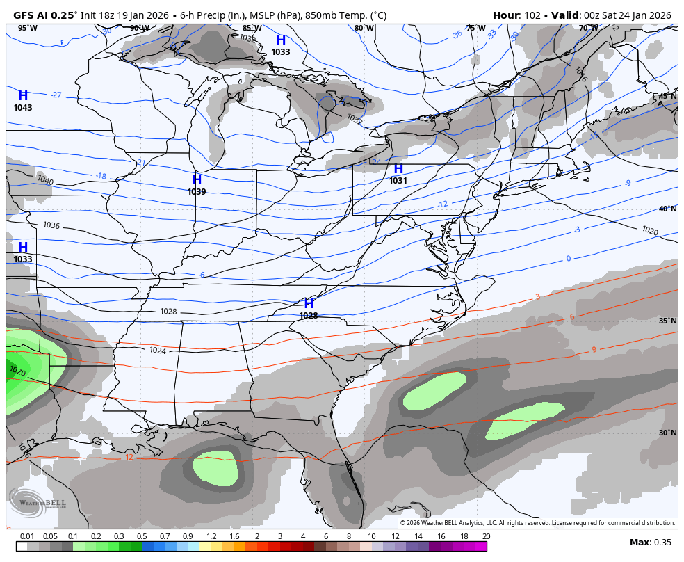 The GFS AI also doesn’t show precipitation types and is similar to the above, but it’s also in two waves…