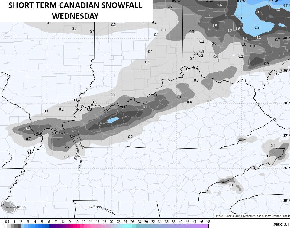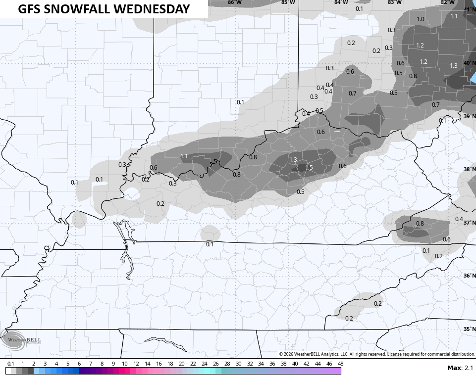 This has an increasing chance to put down a light snowfall for parts of the Commonwealth. The best chance of seeing this is in a swath from western Kentucky toward the Lexington metro and then north.