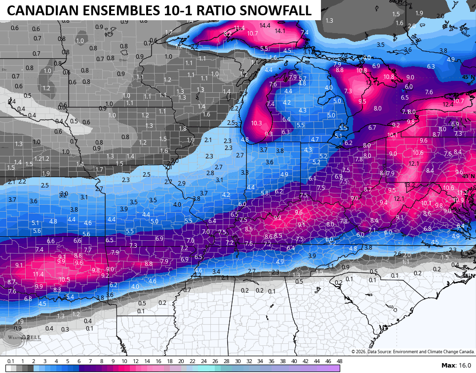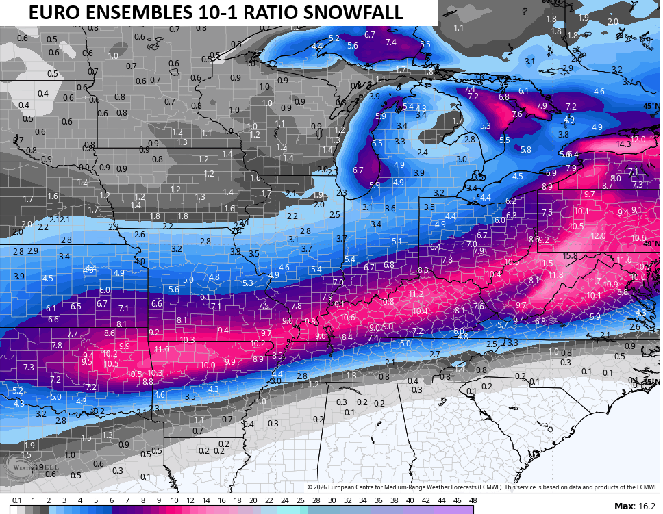 I like to look at the Ensembles at times like this to get more of a smoothed look at what they’re thinking. The core of the greatest snowfall cuts right across Kentucky on the EURO Ensembles…