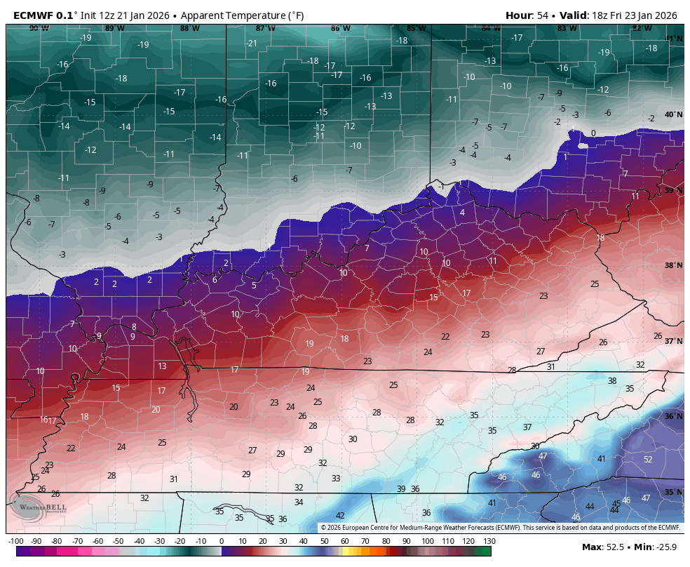 Brutally cold temps and wind chills show up behind the Friday arctic front. Look at the actual temps from the EURO starting at 1pm Friday and ending at 7am Saturday…