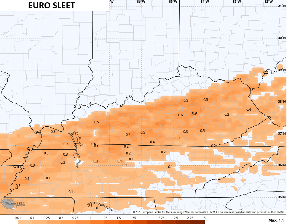 It’s also now showing higher freezing rain totals than before, but it has this farther south than the other two models…