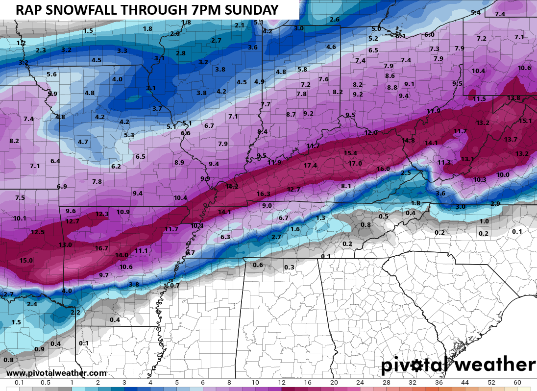 We are getting within range of the RAP so it’s time to look at it a little more. The latest run of the model is pretty far south with the heaviest snow through 7pm Sunday…