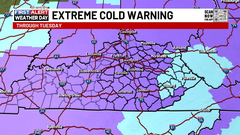 Our Extreme Cold Warning continues for most of Kentucky tonight and early Tuesday as wind chills drop to -20 at times…