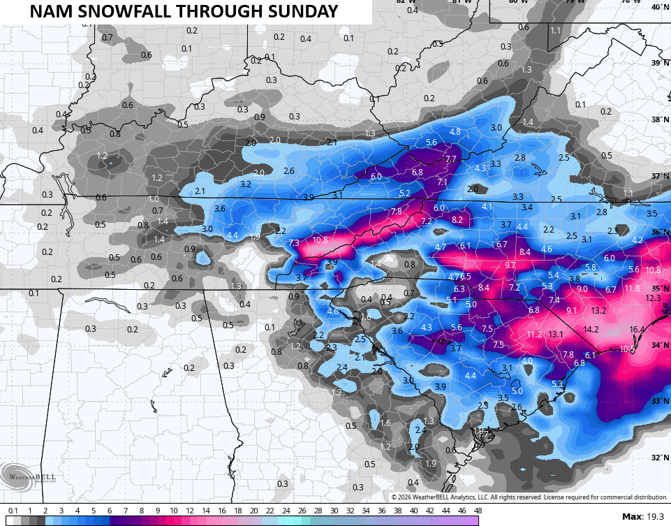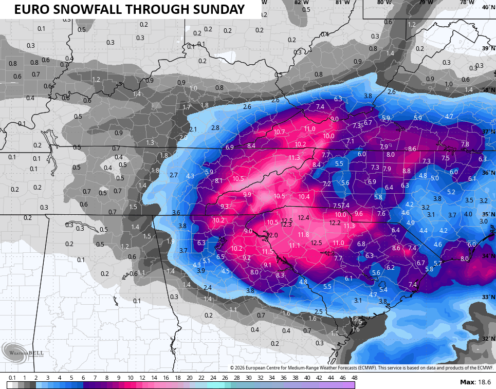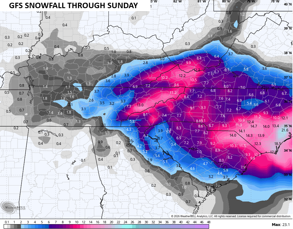 Good afternoon, everyone. Let’s upgrade to a Winter Storm THREAT for far southeastern Kentucky where we have an increasing likelihood of 4″ or more of snow through the upcoming weekend. This system will put down lighter snows for the rest of the state with bitterly cold air again.