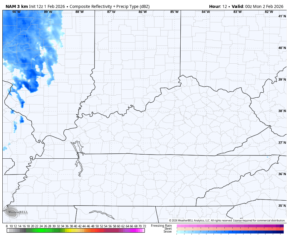 Periods of light snow and some flurries move in later tonight into Groundhog Day Monday. Here’s the Future Radar from the Hi Res NAM showing the light stuff…