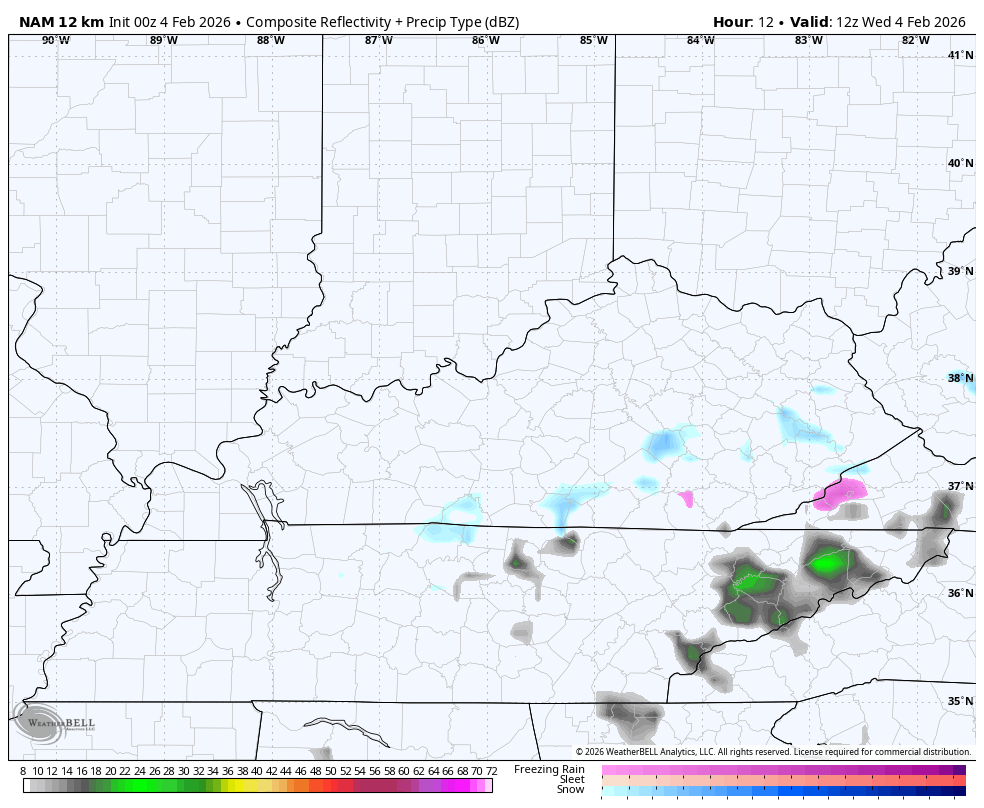 A light snow shower maker may return by Thursday night with a better chance for a swath of light snow and snow showers for central and eastern Kentucky. Here’s the future radar from the NAM from Thursday night through Friday night…