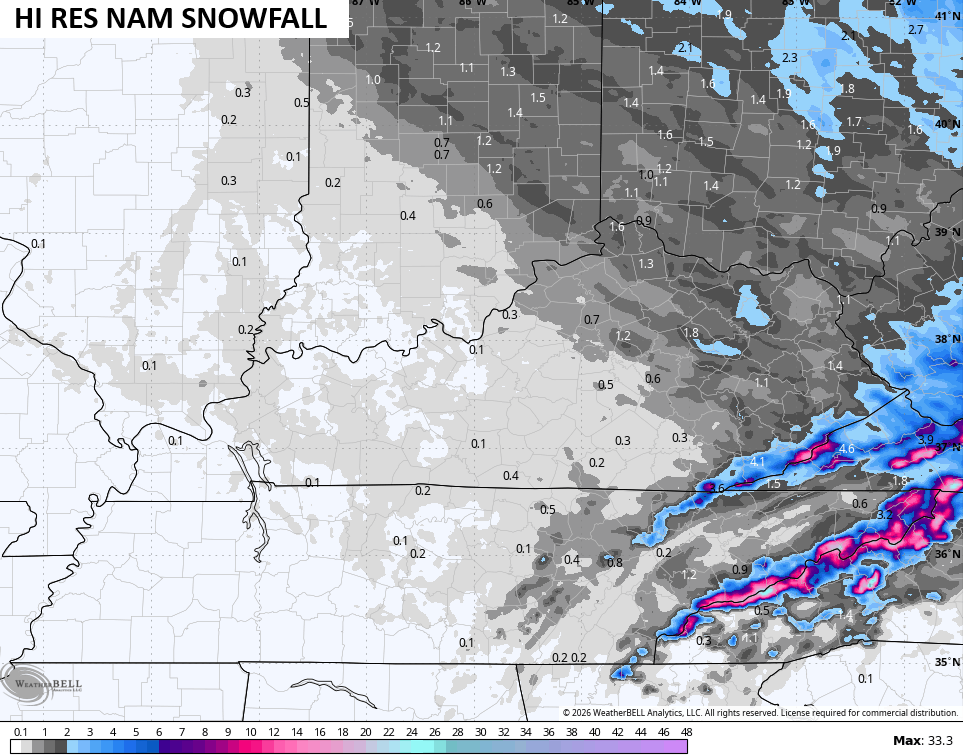 The Hi Res NAM is spitting out some snowfall totals of better than 1″ with some healthy totals in the high mountains along the Virginia border counties..