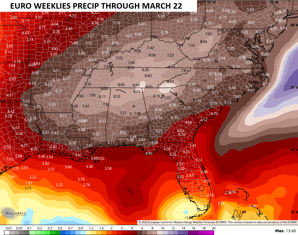 With the orientation of that trough and some semblance of a flat ridge across the southeast, it’s likely to set us up with an active storm track for our region. This means the increasing potential for a lot of precipitation…