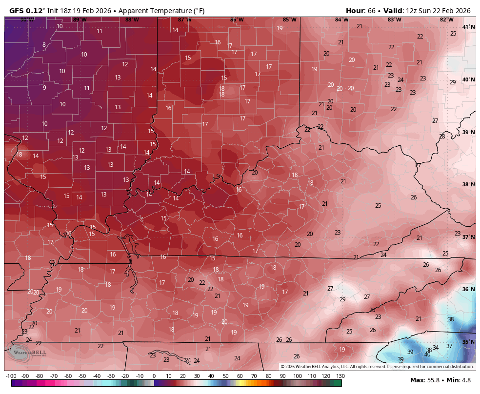 Temps come way down and may not get above Freezing for Sunday and Monday. Winc chills may drop into the high single digits for some. This animation runs from 7am Sunday to 7am Monday…![]()