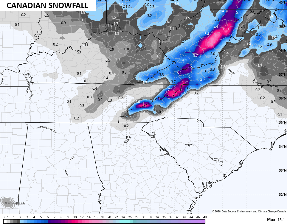 The snowfall map from the Canadian shows a light snowfall for much of central and eastern Kentucky…