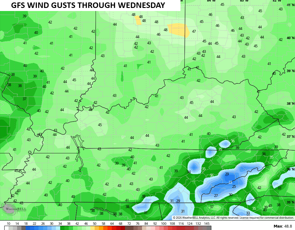 Temps rebound later Tuesday with another weak front possibly bringing a stray shower in here early Wednesday. This will have some very gusty winds with it and we may top 40mph at times…