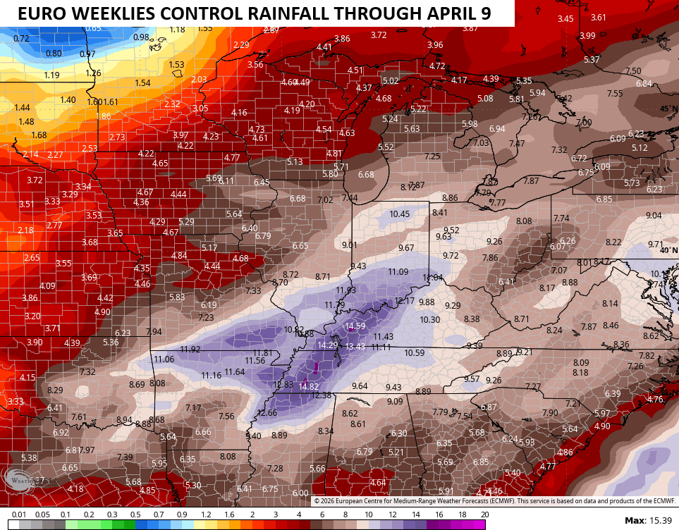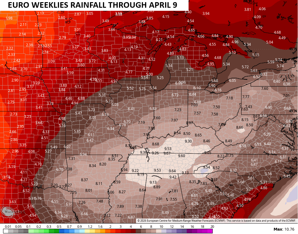 This back and forth pattern should roll right through March, providing our region with a very active setup. This leads to the bullseye of heaviest rains right on top of our region…