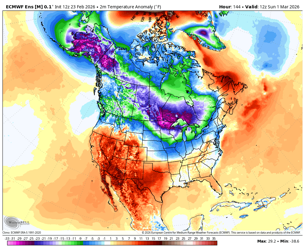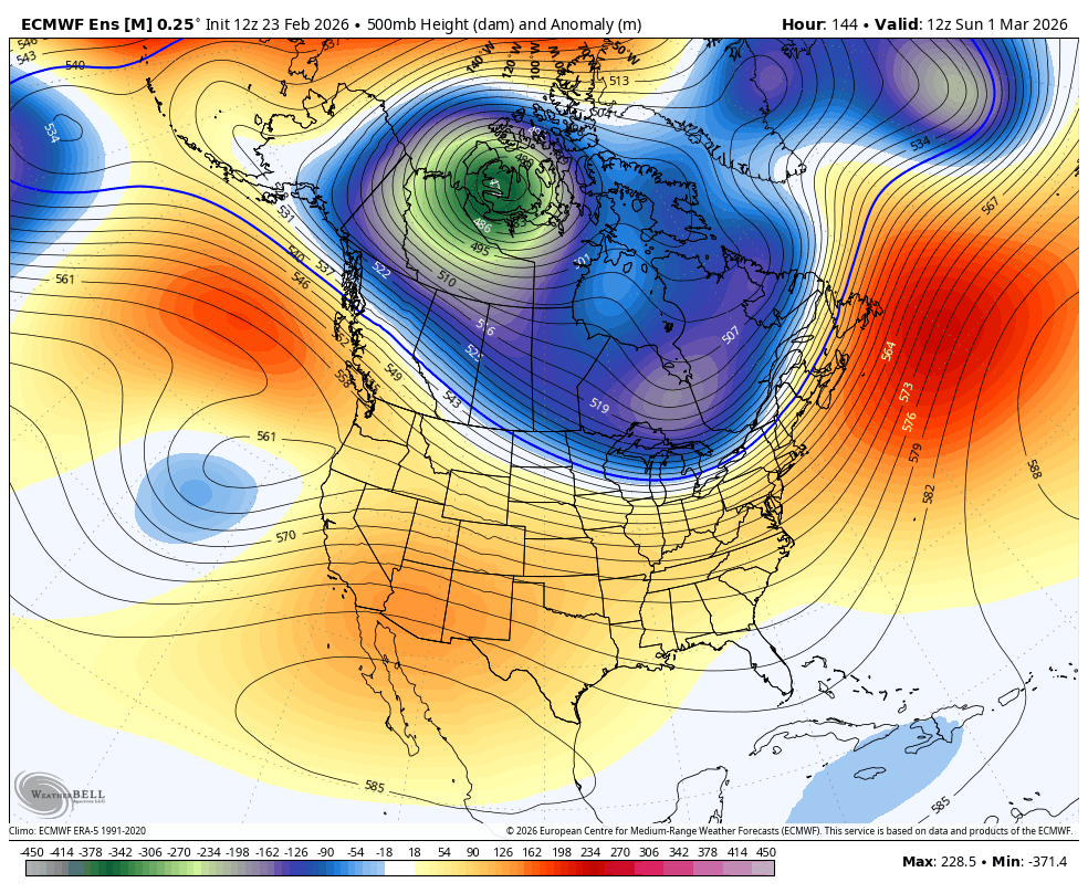 The EURO Ensembles show troughs moving through the east to start March with a big ridge following that…