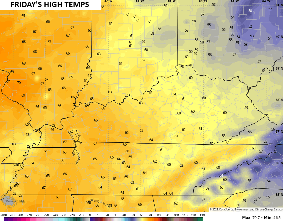 A weak front then sags into the region on Sunday, dropping temps. This drops the numbers from north to south Sunday, likely setting us up with another stout north-south temperature gradient into Monday. That’s when another low pressure rolls eastward along it, bringing the potential for rain and, perhaps, some winter weather. That may have another system right on its heels for Tuesday as temps rebound. That sets us up for the potential for 70 degree temps later next week.