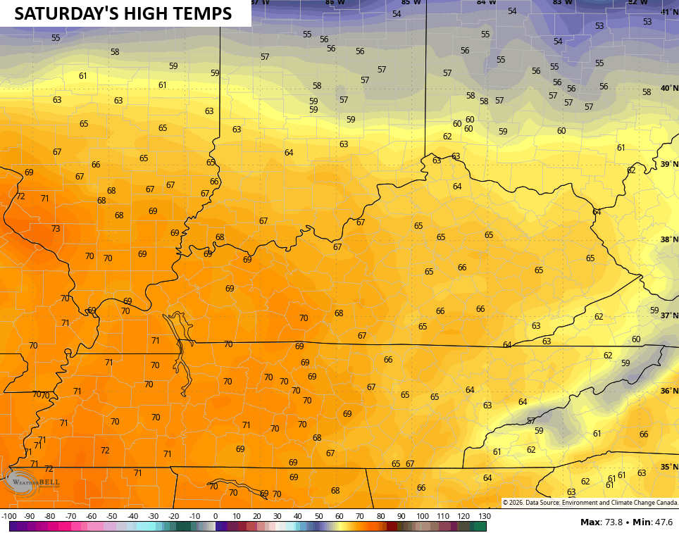 Low and middle 60s then show up for Saturday with locally higher numbers in the west…