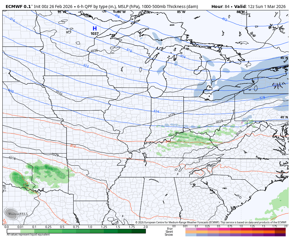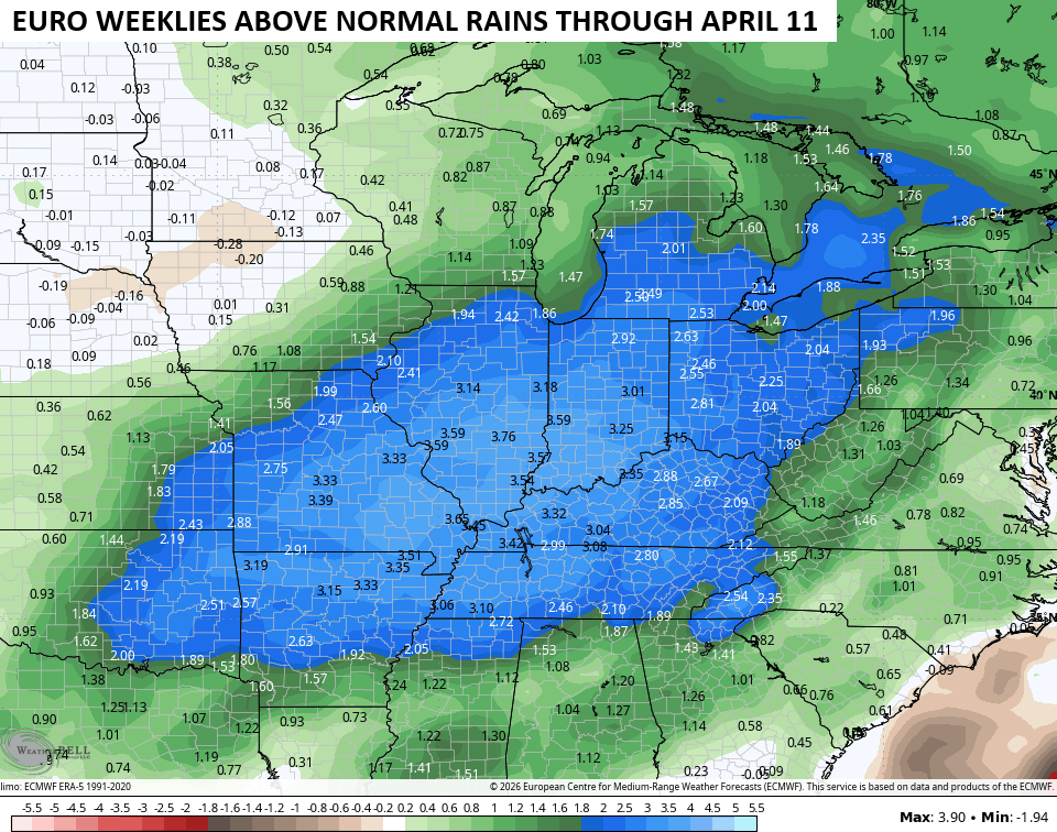 The latest rainfall forecast from the EURO Weeklies continue to highlight my very active early spring pattern. The average rainfall forecast from the 101 members that make up the weeklies is concerning…