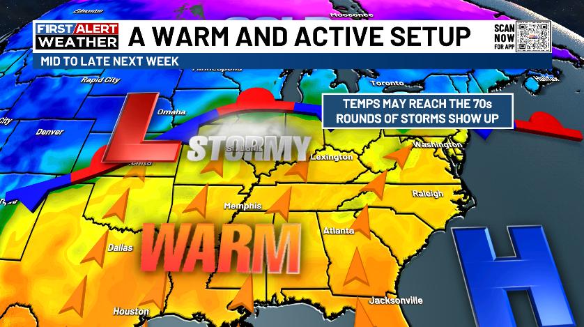 The pattern after this will feature a serious surge of spring with temps heading toward an extended run in the 70s. This may come along with rounds of storms…