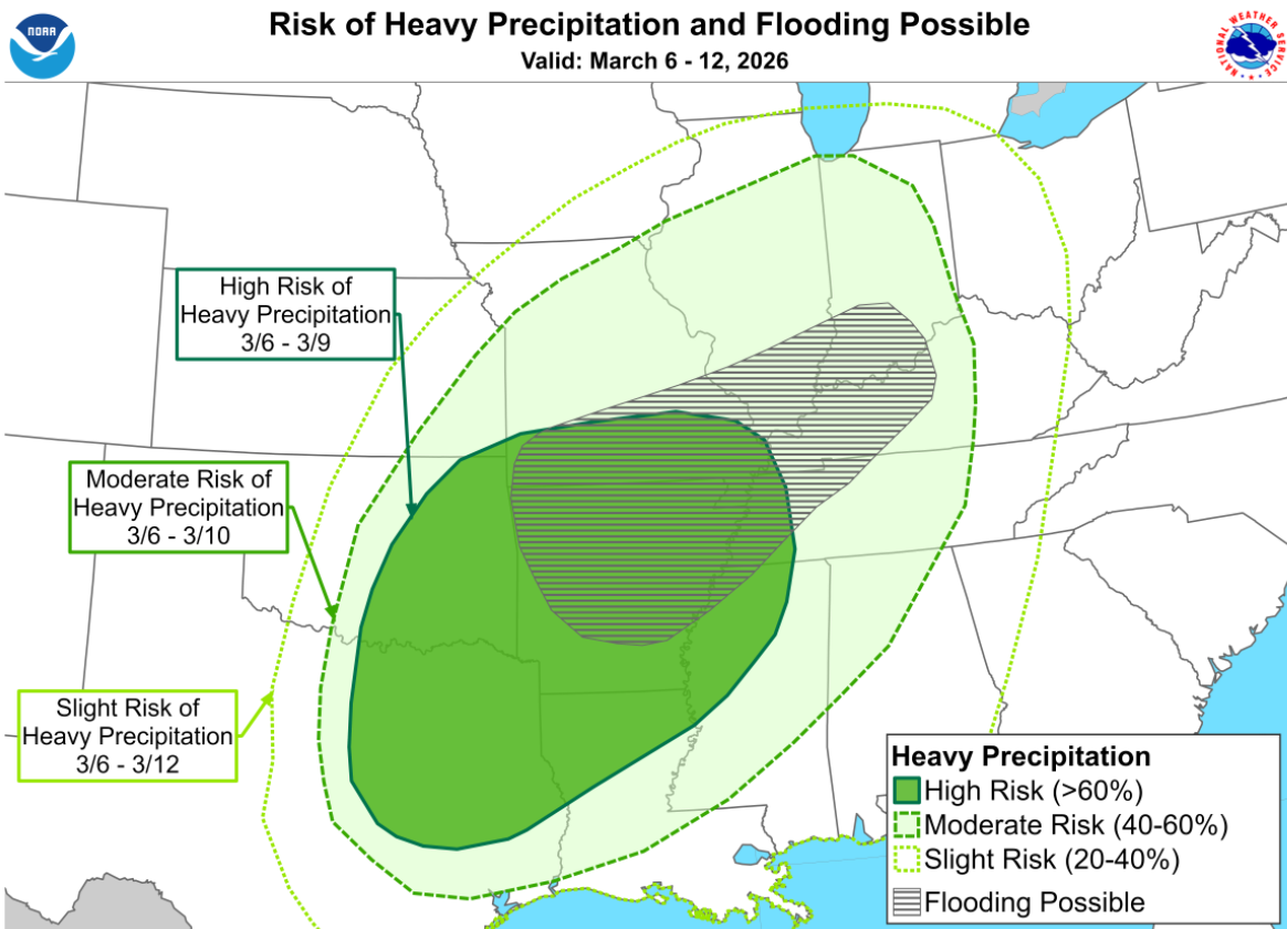 For a few weeks now, I’ve been very loud with my thought on this spring being a very wet one and I see no reason to change that thought. The Weather Prediction Center sees this potential cranking in early March. Here’s the risk for heavy rain and flooding for the March 6-12 time period…