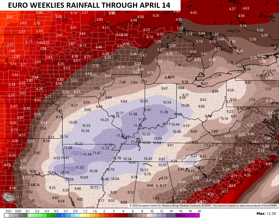 This isn’t just limited to the first half of March, but it’s one likely to roll through the rest of the month and into the first half of April. The EURO Weeklies have a very concerning look with widespread heavy rains around here and from much of the Great Lakes through the Mississippi Valley…