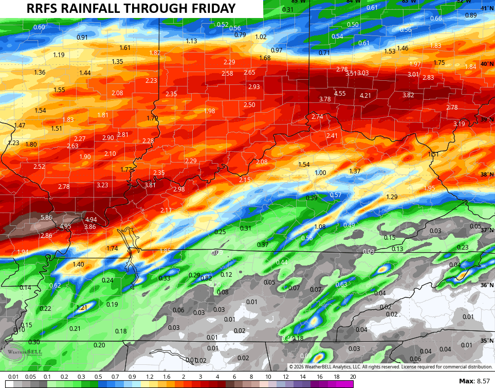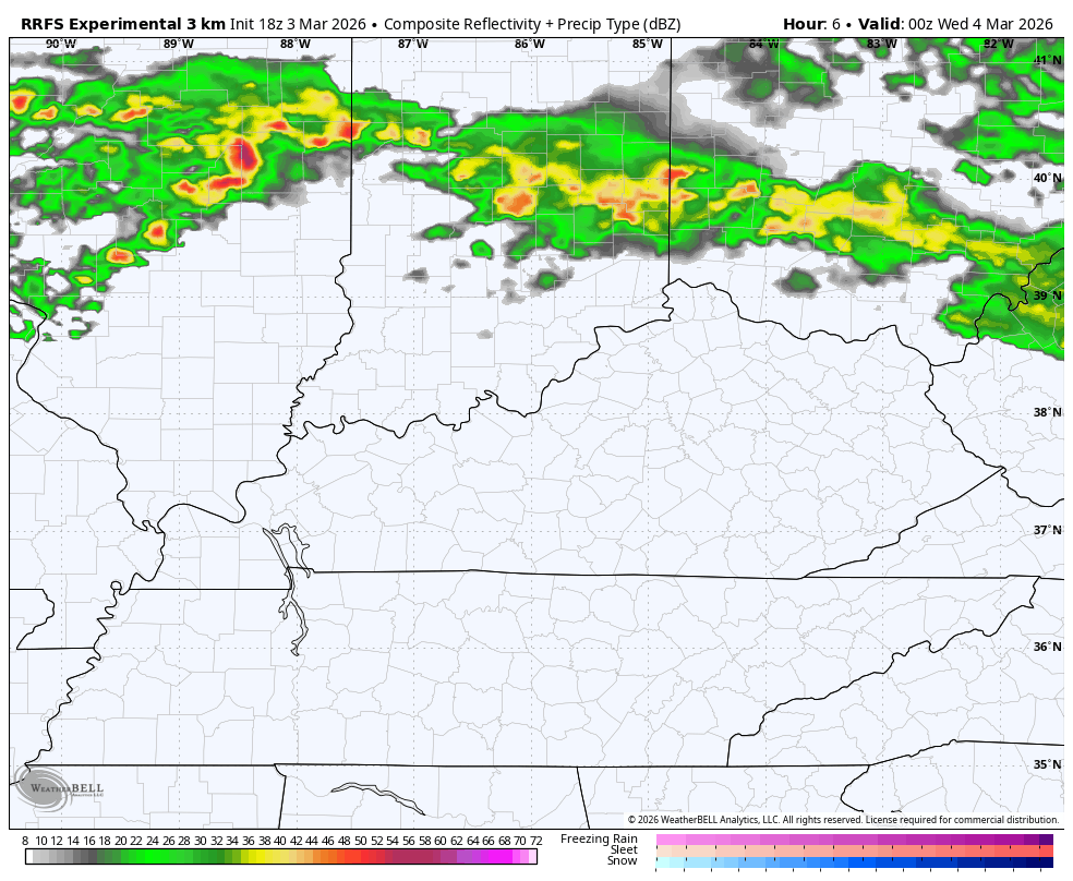 The future radar from the HRRR goes through Friday and shows how these storms do focus much farther south into Kentucky…