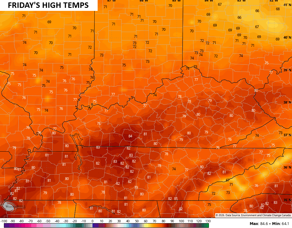 Friday’s highs jump into record high territory of 75-80 degrees with the potential for a few low 80s in the south and southwest…