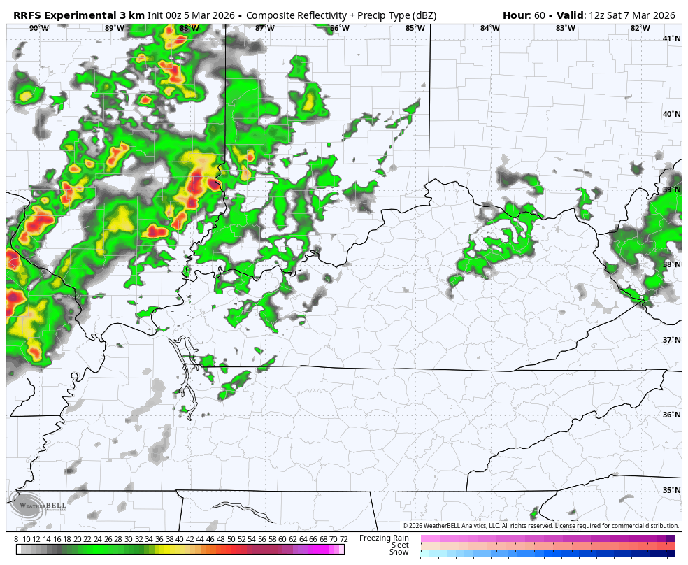 A cold front slides in late Saturday, bringing a line of showers and thunderstorms through here into Sunday morning. That action clears up quickly from west to east early Sunday. Here’s the RRFS Future Radar from 7am Saturday through 7am Sunday…