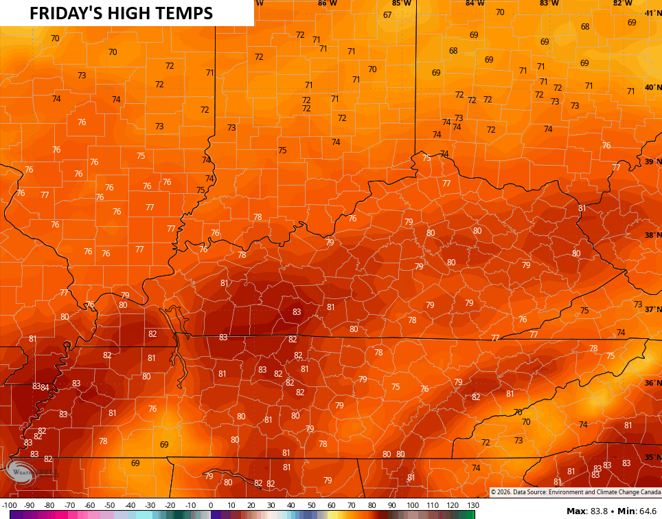 As that boundary lifts northward, a warm southerly wind flow brings upper 70s and low 80s in here for Friday…