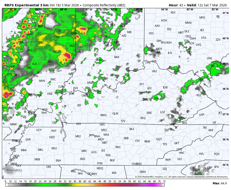 A cold front then moves in on Saturday, bringing showers and thunderstorms through here. The future radar from the RRFS from Saturday morning into Saturday night looks like this…