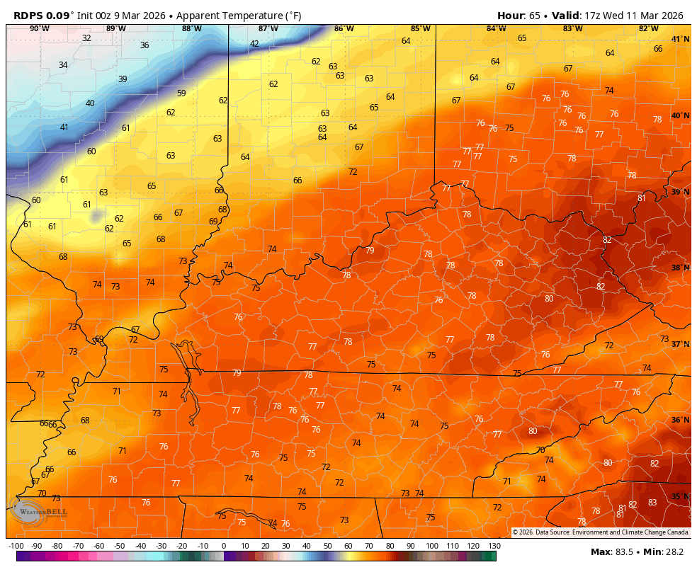 Temps on Wednesday surge to near 80 degrees across parts of central and eastern Kentucky before tanking behind the cold front sweeping through Wednesday night. Wind chills reach the mid and upper 20s by Thursday morning with the chance for a few snowflakes.