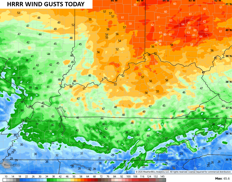 Let’s start with today’s winds. A Wind Advisory is out for much of Kentucky as gusts reach 40mph to 50mph with some higher gusts. The short-term forecast models suggest several areas go above and beyond 50mph at times…