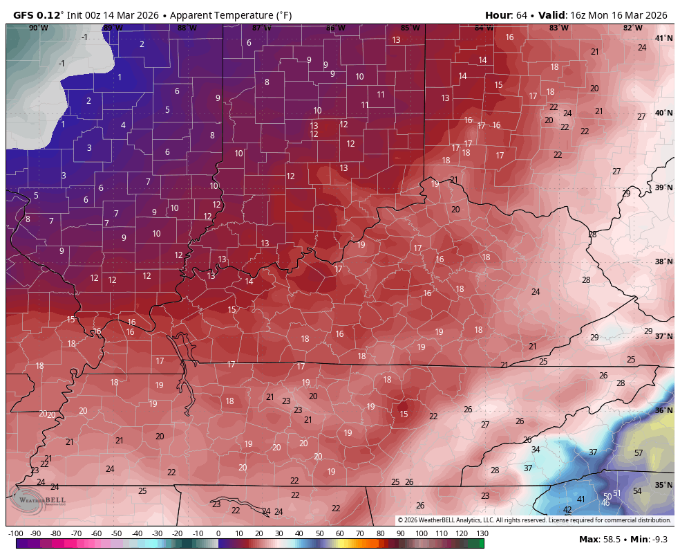 The temps change behind this is about as dramatic as you will ever find. Watch the “feels like” temps drop from Sunday evening through Noon Monday…