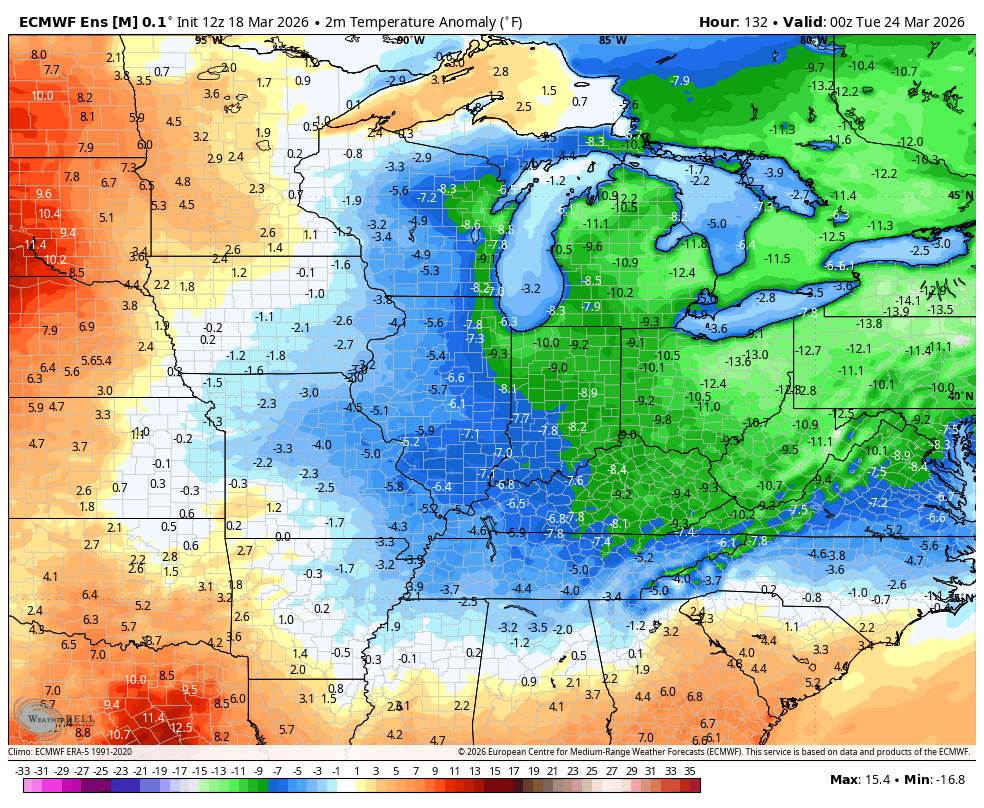 A cold front brings some showers and storms in her Sunday nigt and Monday as temps come way down. We go back to below normal for a few days as we continue with a back and forth temperature setup through the rest of the month into the start of April…