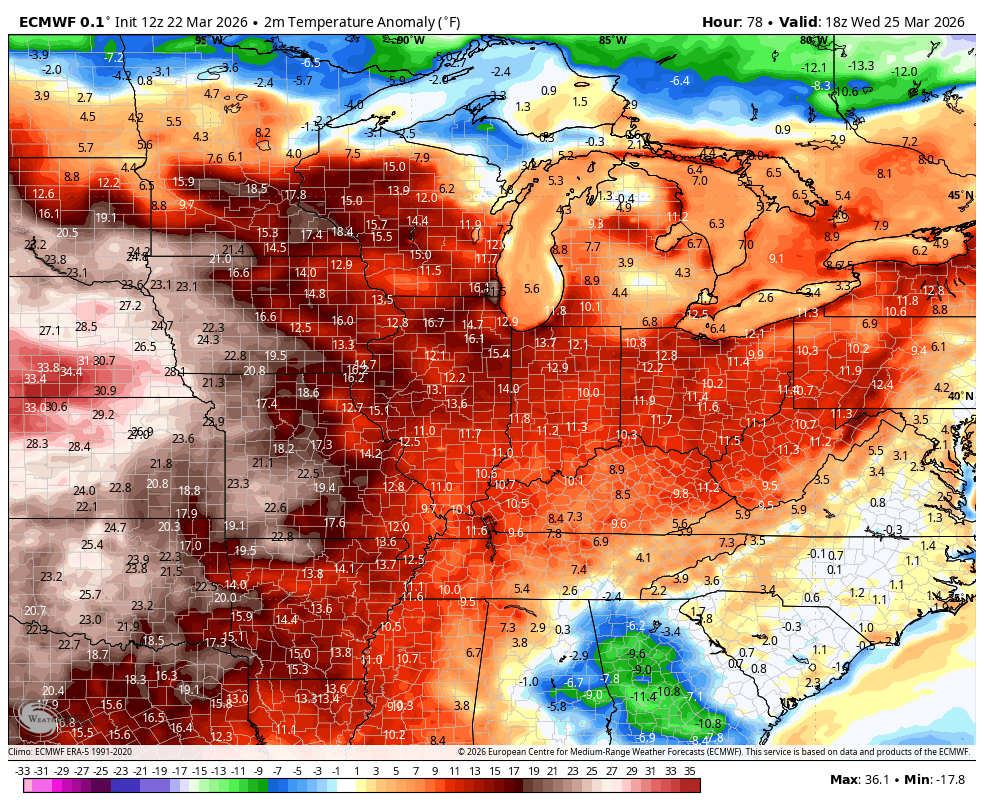 Well above normal temps go back to normal or below right behind the boundary into the start of the weekend…