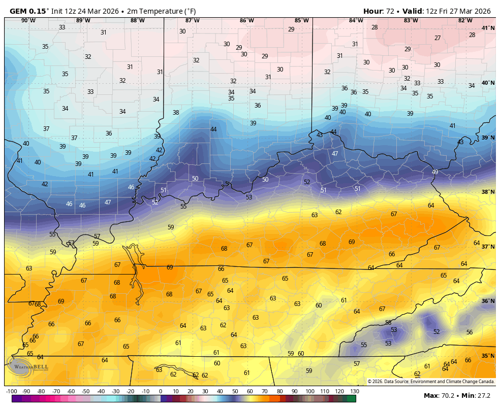 Temps will absolutely get crushed behind this boundary. Readings will drop rapidly from north to south as the front slams through. Areas that start the day in the 70s will drop into the 40s by the afternoon with 20s waiting on us Friday night and Saturday morning. This animation shows the temps from 8am Friday through 8am Saturday…