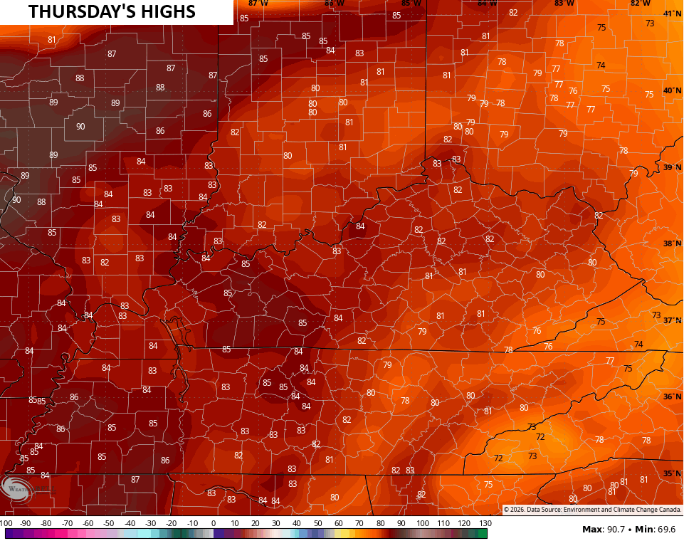 Once this moves away, we jump back into the 80s for most of the state…