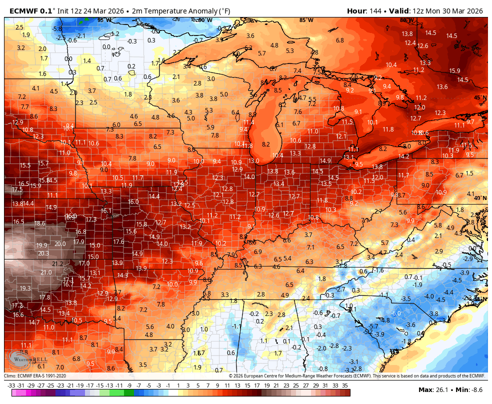 Above normal temps look more likely, but those below normal numbers behind the fronts will boost the severe storms threat. Here’s a look at the temperature deviations from normal from Monday through the first week of April…