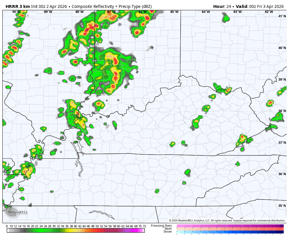 Isolated storms are showing up across parts of the state with a better shot of storms to our north and northwest. A couple of those sneak back in here tonight and Friday. This HRRR future radar starts at 8pm this evening and rolls through 8pm Friday…