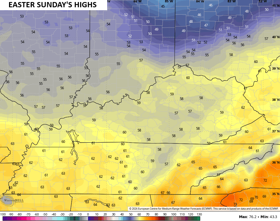 This leaves us with clearing skies for Easter Sunday with much cooler winds blowing. Highs range from the upper 50s to low 60s…