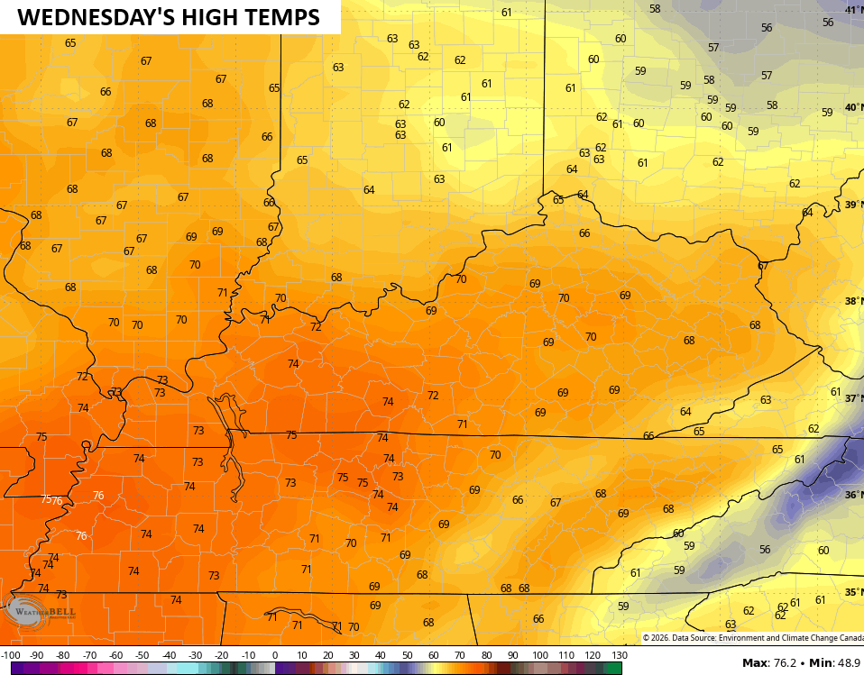 The numbers really jump on Wednesday afternoon with most of the state surging toward 70…