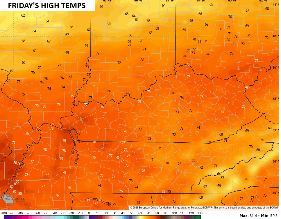 Friday jumps even more with 75-80 for most areas…
