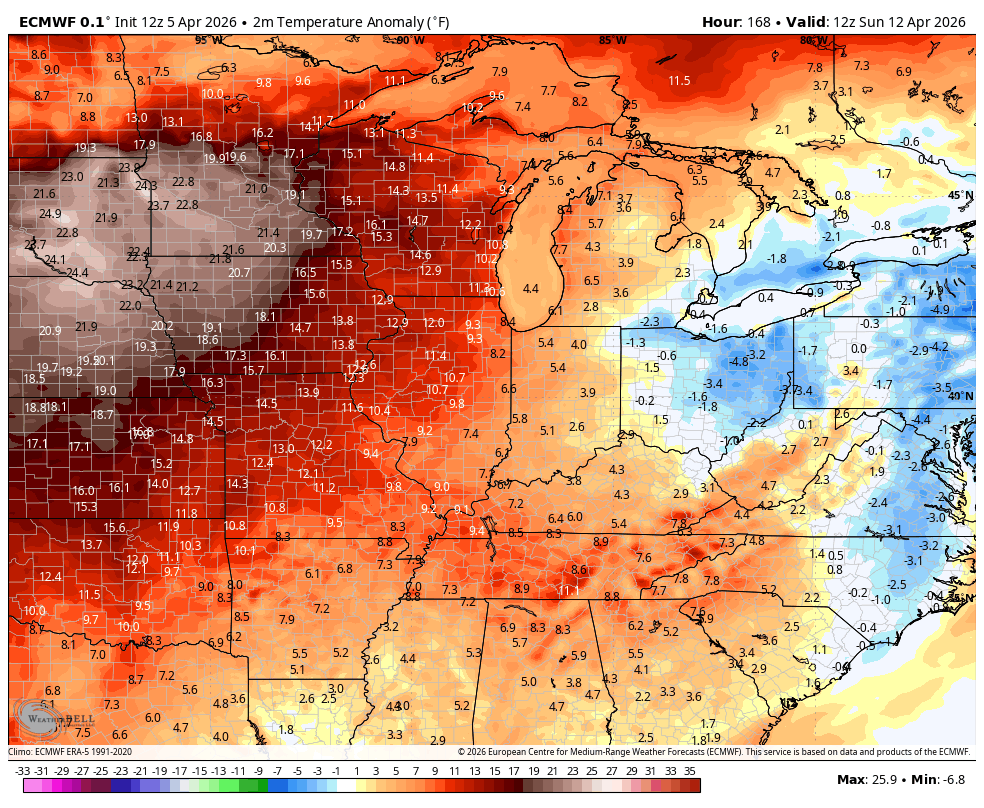 There is a front that can approach the region late this week with a shower or storm, but the warm air is set to overwhelm the pattern again. Look at the above normal temps from this Sunday through the following Saturday…