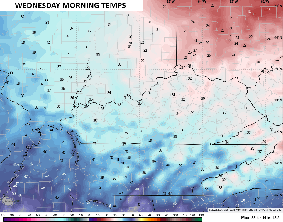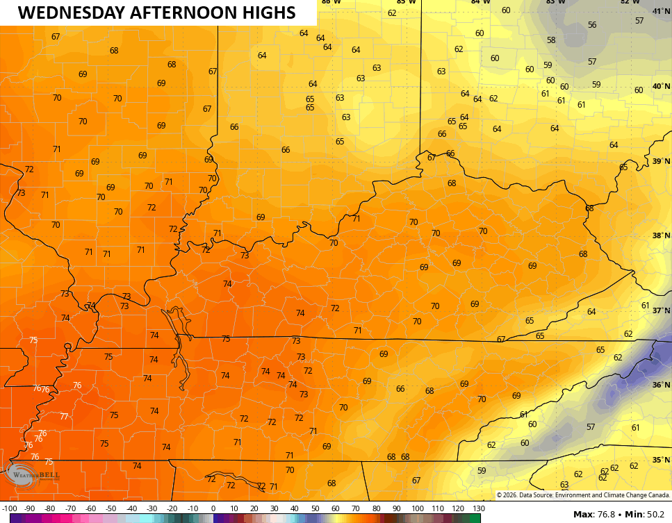 Winds become southwesterly Wednesday afternoon with a rebound in temps. Highs reach the upper 60s to low 70s for central and eastern Kentucky