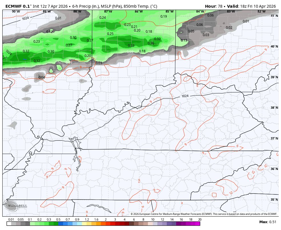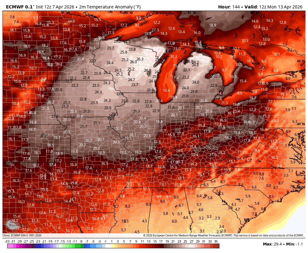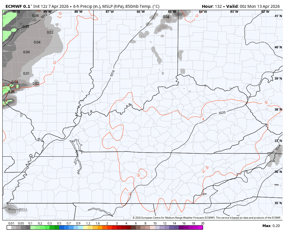 The warm weather continues into next week with the models now indicating a better chance for some thunderstorms sweeping through here. Here’s the EURO next week into next weekend…