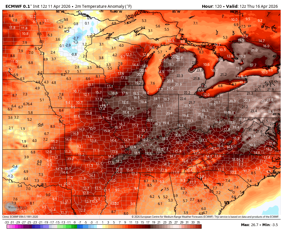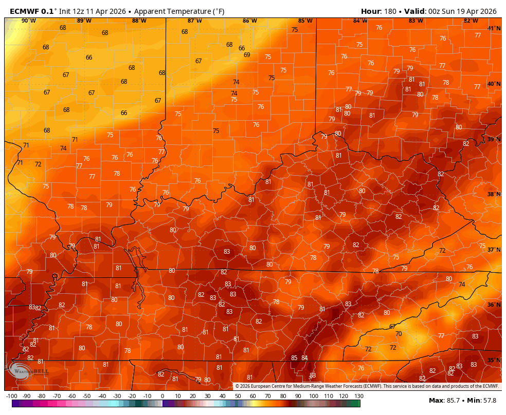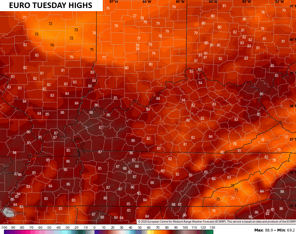 With the chance for some scattered storms, temps come down a bit for Monday but shoot right back up by Tuesday and Wednesday. Temps jump back into the 80s with the Canadian suggesting we flirt with 90…