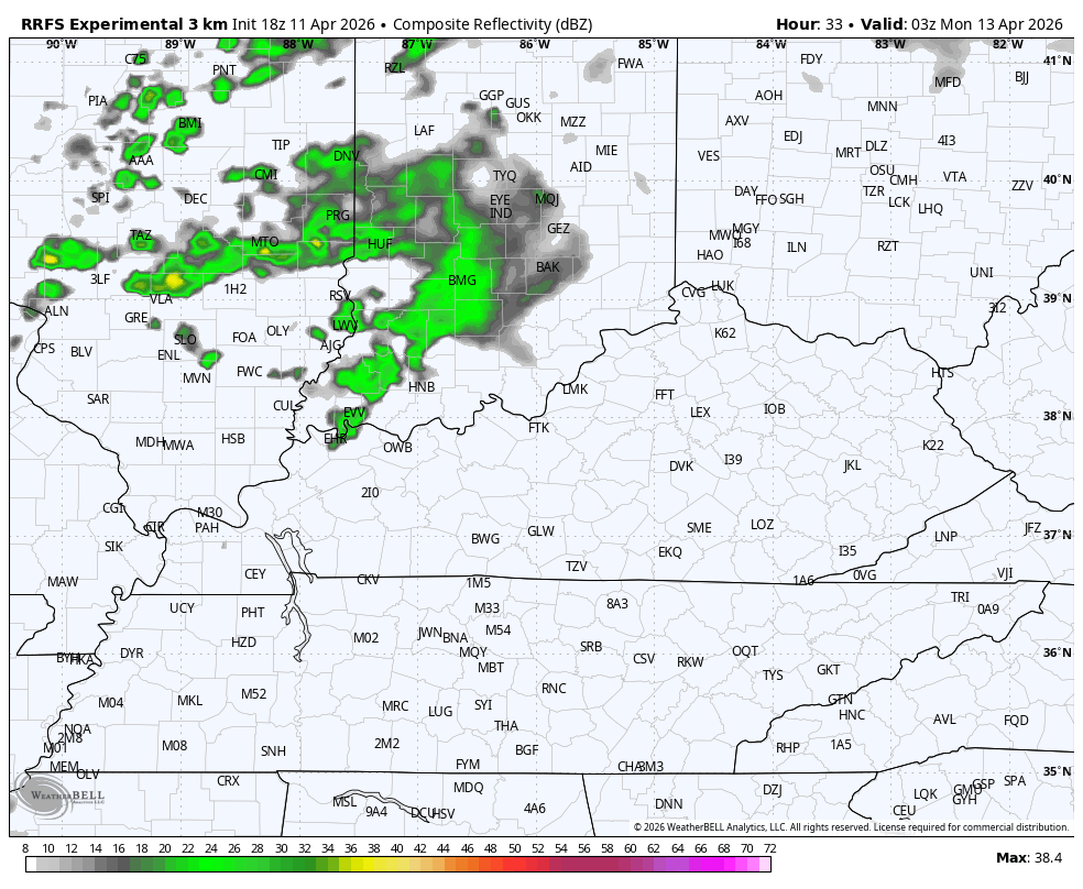 The chance for some scattered showers and storms will move in late tonight into Monday, but this isn’t very widespread at all. This future radar runs from 11 this evening and goes through 8pm Monday…