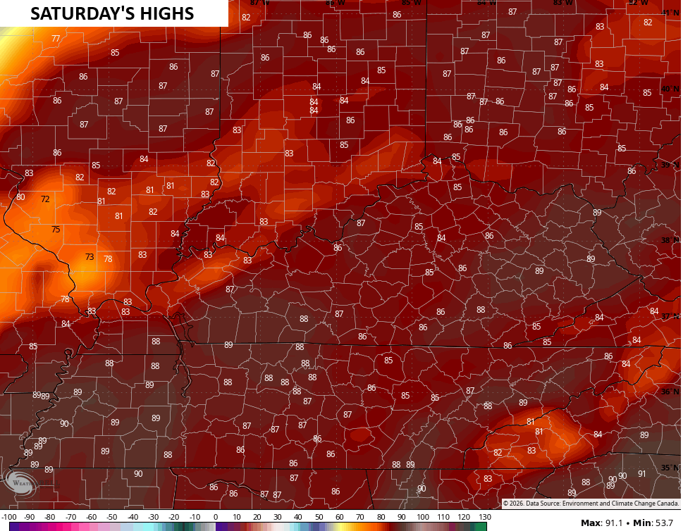 Friday has the temps back into the 80s with another massive jump into the mid and upper 80s for Saturday…