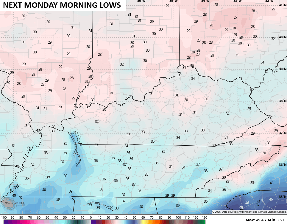 Highs on Sunday are in the 50s on a cool northwest wind. With clearing skies and light winds, frost and a light freeze will be possible Sunday night and Monday morning. That’s when temps may be at or below the freezing mark…