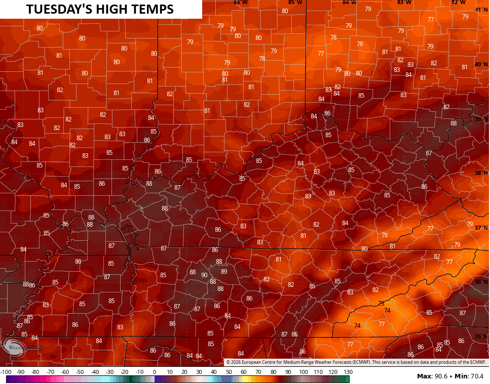 As those storms move way, we find temps jumping up to summertime levels for the rest of the week into the start of the weekend. Tuesday highs are deep into the 80s…